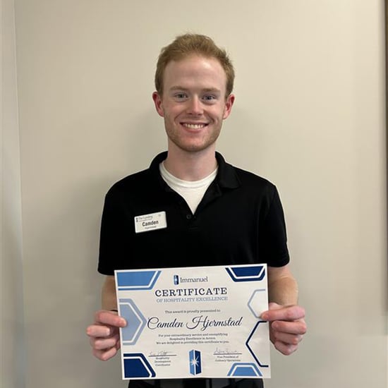 Camden Hjermstad, a server at The Landing, has been recognized by the Immanuel Culinary Leadership Team for exemplifying extraordinary hospitality.